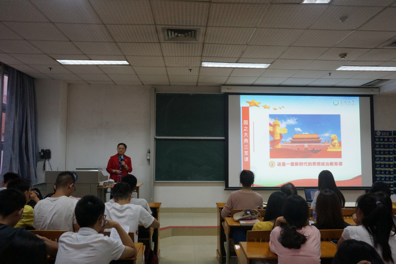 思政课堂在同学们“爱国爱党爱校,同心同向同行”的朗读声中开始。李院长以中华人民共和国成立70周年庆典为切入点,通过与同学们分享观看盛典的感受引入本次思政课的讲授。