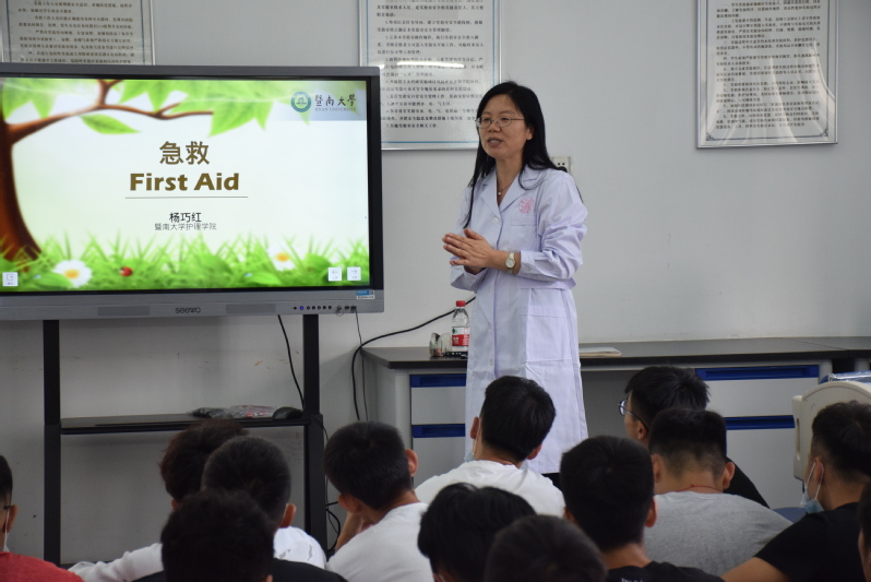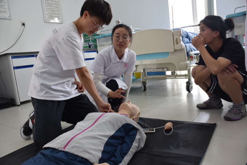 杨巧红院长首先进行理论知识讲解,她将急救知识理论、技能与日常生活实例相结合,让同学们了解心跳呼吸骤停、异物梗阻的临床表现,并详细讲授心肺复苏术的操作及意义,重点讲解了胸外按压与人工呼吸两项操作。认真听讲的同时,同学们与老师积极互动,抢答问题,在轻松愉快的教学氛围中学习到专业的急救知识。