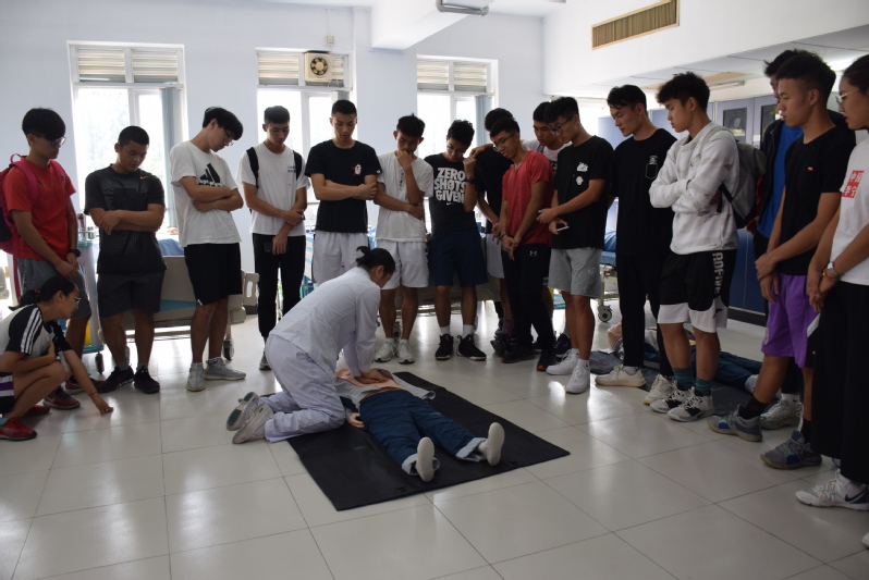 随后,今年会志愿队和体育学院的同学们随机组队练习,在专业老师的指导下,利用模拟人进行心肺复苏操作,对胸外按压的部位、频率、深度和气道开放消除异物的方法以及人工呼吸进行操作演示,到场的每一位同学都得到了充分的练习机会,两个学院的学生不时交流探讨,学习气氛轻松热烈。