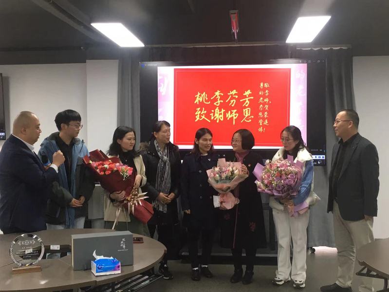 仪式上,大家一同观看李教授执教生涯的记录视频,内容包含她与学生、她与工作、她与生活等影像,以及众多校友的祝福短视频。随后,院长陈伟菊、副院长杨巧红、副书记陈卓松共同为李教授送上荣休纪念奖杯及礼物。
