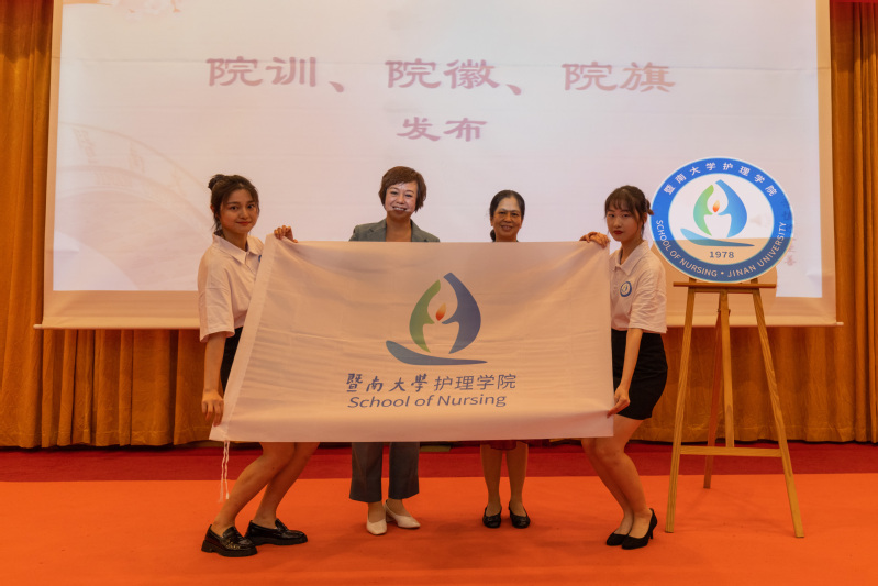 接下来,陈伟菊及龚华芳对院训、院徽、院旗进行发布。龚华芳和设计者熊佳铭同学讲述院徽的设计理念,希望护理学子传递人文关怀的理念,怀揣成爱心、耐心、细心与责任心对待护理工作。院训“仁爱至善,笃学慎行”八字,暨南护理人对生命常怀敬畏之心,将对生命的关爱、照护作为自身最高修为,践行南丁格尔誓言;以勤思好学、一丝不苟的态度精进技术,终不负患者“健康所系,性命相托”的信任。
