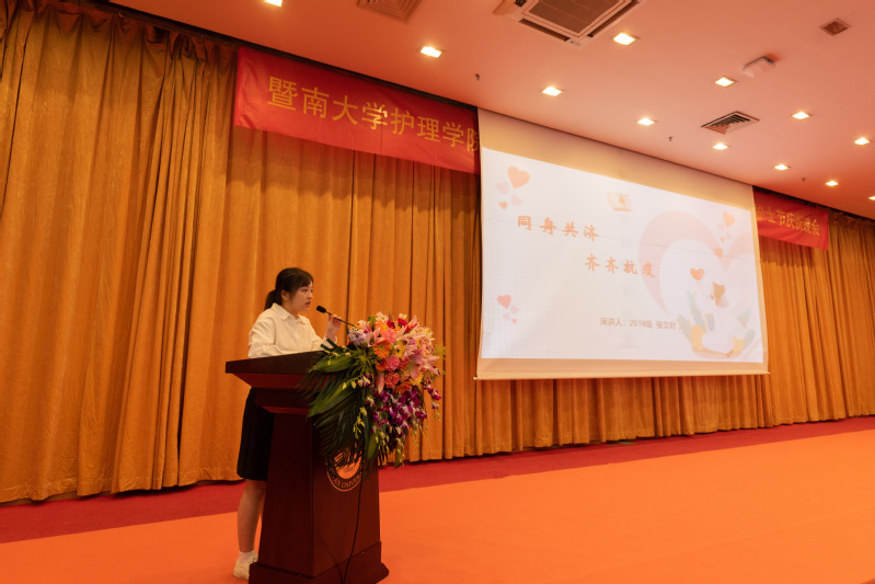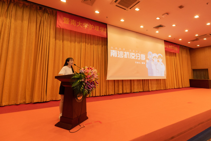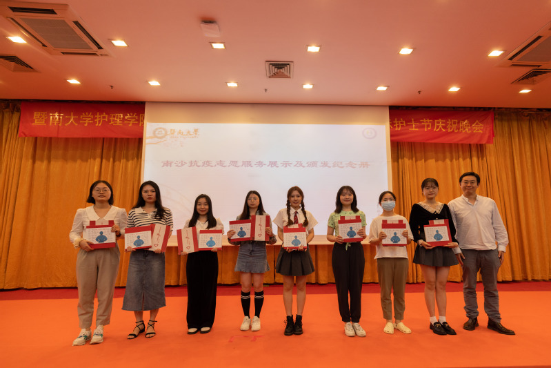 接着,南沙抗疫的志愿者们分享他们的抗疫经历和感悟,并由南沙抗疫志愿者服务队第二队队长王子文老师为其颁发纪念册。一代人有一代人的使命,面对严峻的疫情防控形势,护理学子有担当、有责任、有行动,体现了护理人的使命。抗疫志愿者队伍在南沙共计服务10天,队员们不畏酷暑,风雨无阻。志愿者们用实际行动践行了“健康所系,性命相托”神圣的医学人誓言,诠释了“忠信笃敬”的暨南校训。