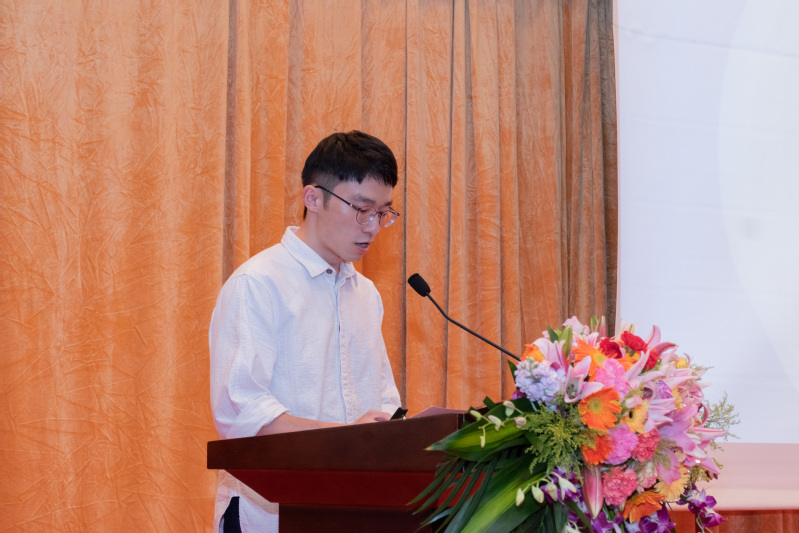 讲解完院训,龚华芳请本次院徽院旗的设计者-今年会2021级研究生熊佳铭上台讲解院徽的设计过程及内涵: