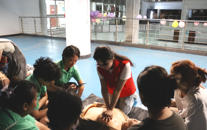 培训工作分两个阶段进行:心肺复苏理论知识讲解、现场实践训练。