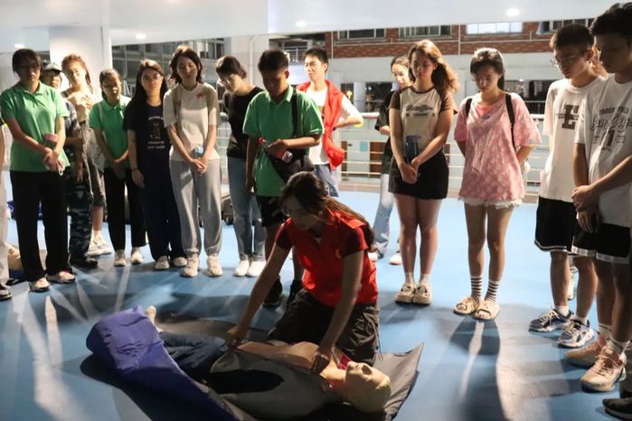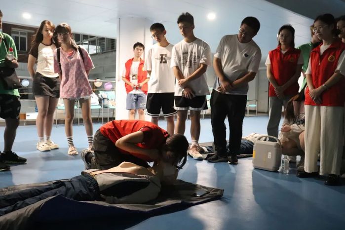 在“世界急救日”到来之际,为弘扬“人道、博爱、奉献”的红十字精神,提升我院2023级本科新生应急救护能力,在意外事故现场能够进行有效救护,推动平安校园建设,2023年9月5日晚上,今年会组织2023级本科新生于医学院楼530会议室进行心肺复苏(CPR)和自动体外除颤仪(AED)使用的理论宣讲,并在理论授课后由志愿者带领新生前往医学院楼4楼平台开展心肺复苏术实操训练。我院“提灯青年志愿服务队”和2023级本科新生共计50余人参加本次心肺复苏培训活动。