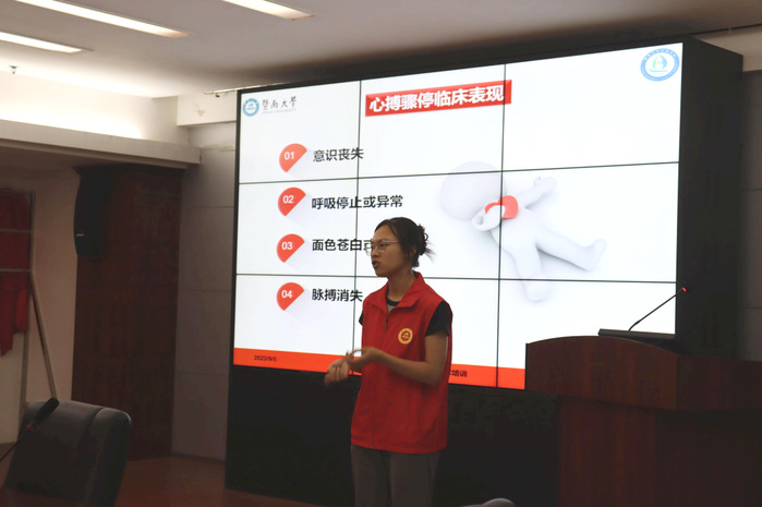 讲解员杨馨同学围绕心脏骤停的临床表现、判断识别、CPR的流程等方面,通过多媒体演示向新生们讲解学习CPR的重要性与必要性,并强调了心肺复苏术的基本原则、注意事项、操作步骤等重点内容。随后,杨馨同学以视频导学的方式介绍了AED的使用流程与注意事项。通过生动的案例分析和互动讨论,让新生们掌握了重要的生命救护基础,为救援行动奠定了坚实的基础。