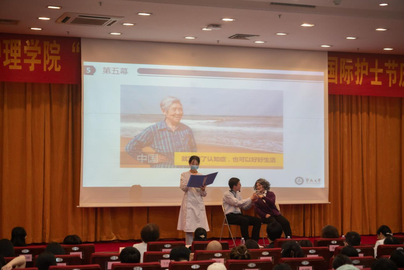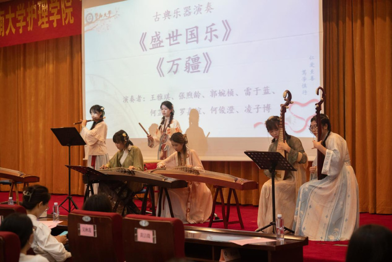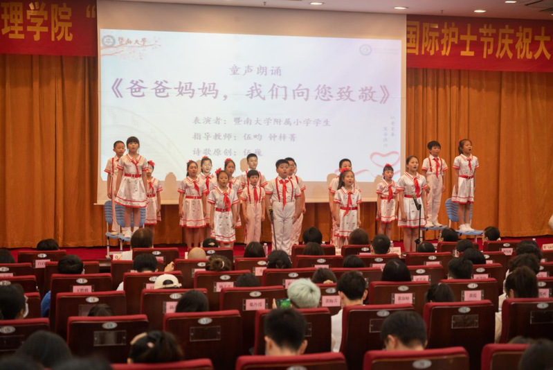 接下来,同学们展示了古典乐器《盛世国乐》、《万疆》、诗朗诵《那个名字》、健康科普宣教剧《认知症早发现早治疗,让生活更美好》、女声合唱《有我》等才艺表演节目。此外,还有来自今年会jinnianhui附属小学学生的童声朗诵《爸爸妈妈,我们向您致敬》。