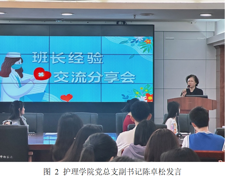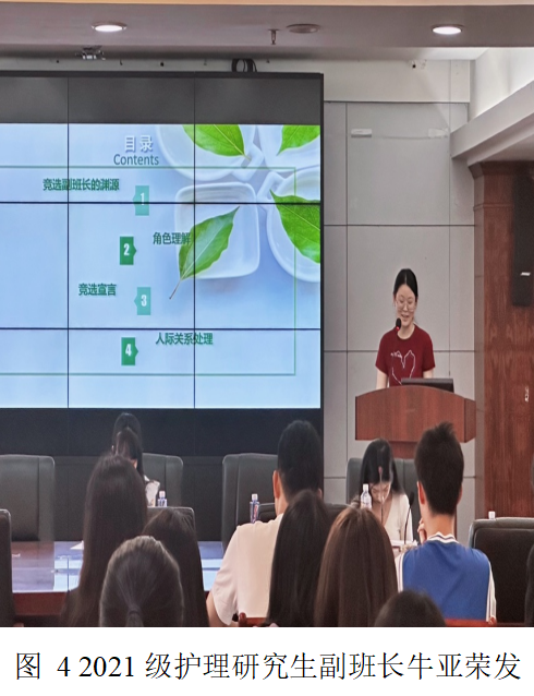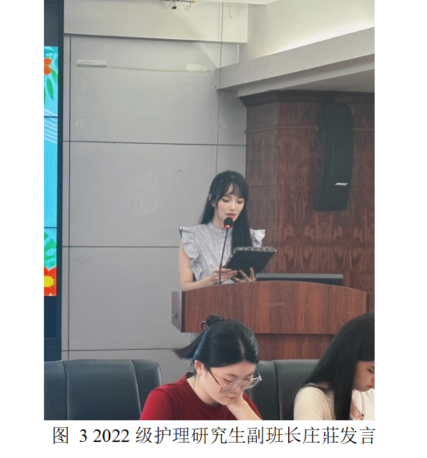 接下来是班长交流换届。22级护理研究生副班长庄莊结合自身任职情况,她表示,研究生三年并不仅仅只有学术,适当参加学生工作和课余活动不仅可以为生活增添色彩,对于求职、就业也是大有助益,丰富的学生工作经历可以使简历锦上添花,并鼓励同学们勇敢上台竞选、主动挑战自我。21级护理研究生副班长牛亚荣分享了任职两年以来对副班长工作的理解与经验,强调正班与副班的正确角色定位以及班委团结协作对于建设和谐班集体的重要性。21级护理研究生班长詹娜妮介绍了班级委员的工作要求与任职优势,以其亲身经历和个人奋斗故事鼓励新生们在研究生阶段不断接触新事物,敢于打破固有思维,培养创新能力,不断提高自我核心竞争力,为未来发展打下坚实基础。