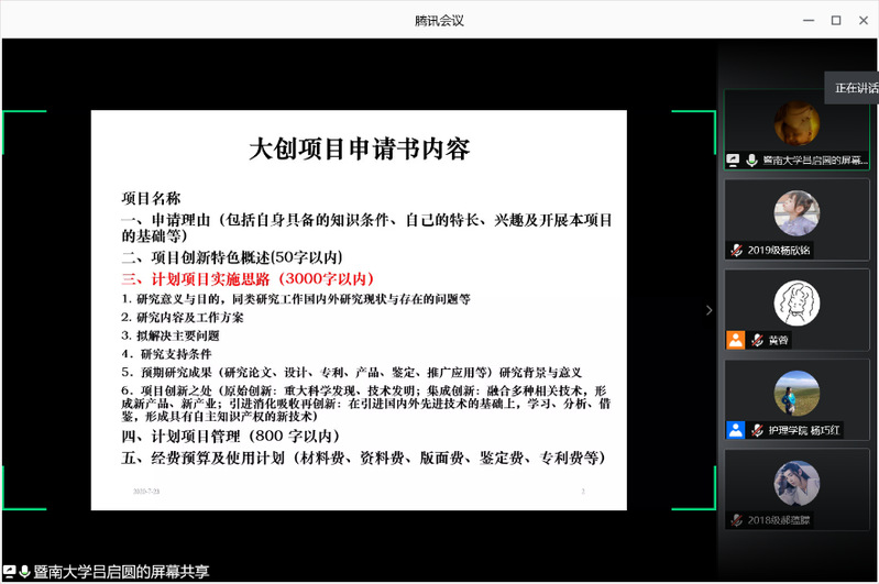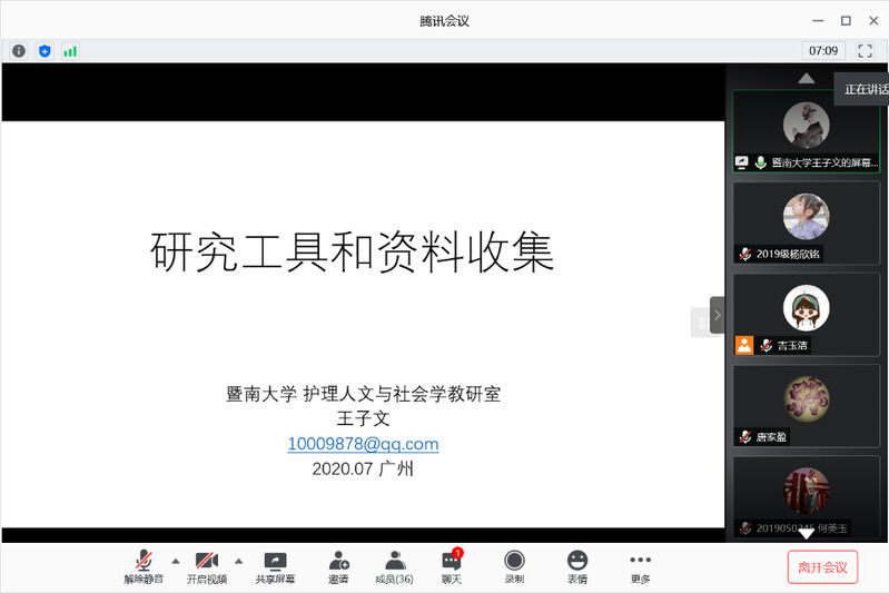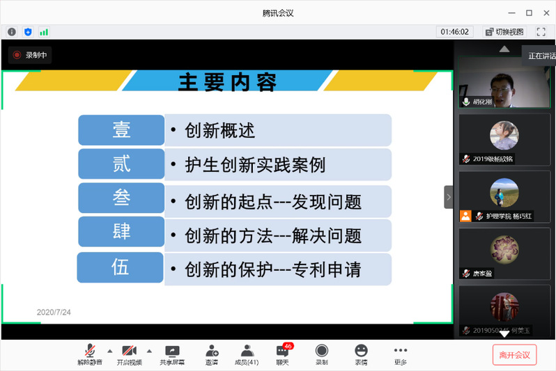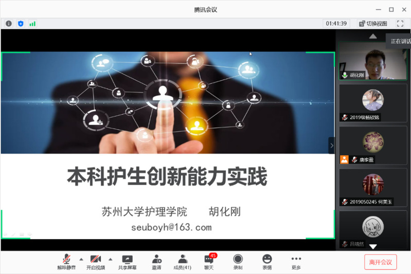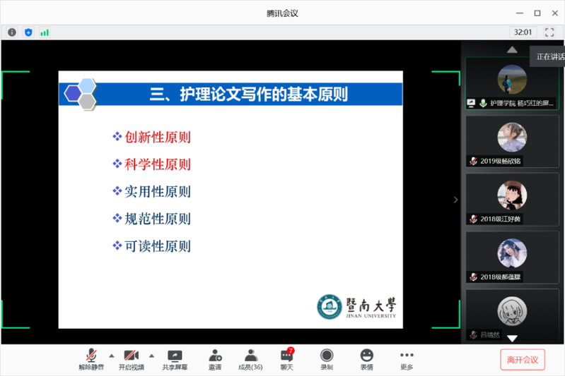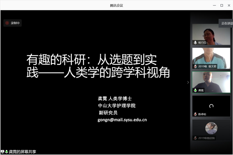 主题讲座活动以在线形式进行,学院邀请了校内外知名教师来为同学们开设讲座,有中山大学今年会人类学博士龚霓副研究员、苏州大学今年会胡化刚副教授、今年会jinnianhui信息科学技术学院项世军教授、今年会杨巧红副教授、今年会吕启圆副教授以及护理人文与社会学教研室主任王子文博士。内容包括科研思维方法的培养、课题选择、科研项目的申报、科研设计、研究工具的选择、科研创新与实践、论文撰写、智慧医疗等。