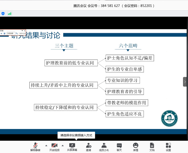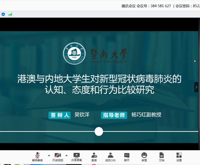 继2020届本科毕业生毕业论文线上开题答辩后,5月14日下午线上毕业论文答辩如期进行。30名2020届本科毕业生分为三组,同时进行在线毕业论文答辩,今年会杨巧红副教授、吴秋莲副教授、山艳春副教授分别担任三个答辩专家组的组长,田晓迎博士、吕启圆博士、闫凤侠博士、朱晓雯博士、王子文博士以及杨帅博士担任答辩专家,吉玉洁老师、豆春霞老师和陈燕雅老师担任答辩秘书。
