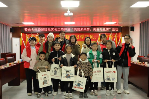 1月22日下午,“暨护小葵花向阳”实践队与周陂社区关工委、乡村振兴人才驿站赴周陂社区党群服务中心联合开展“共筑未来梦,关爱儿童情”心理健康团辅活动。实践队成员和指导老师与孩子们进行了“萝卜蹲”、“珠行万里”、“奇偶数”游戏,孩子们争先恐后参与互动,现场气氛轻松而热烈。游戏结束后,实践队成员和指导老师为孩子们送上帆布包、笔记本、签字本等精美文具并合影留念。此次活动以美育浸润儿童心灵、丰富精神文化生活,将温暖和关爱送到乡村儿童身边,用心用情促进儿童健康成长、阳光成长。