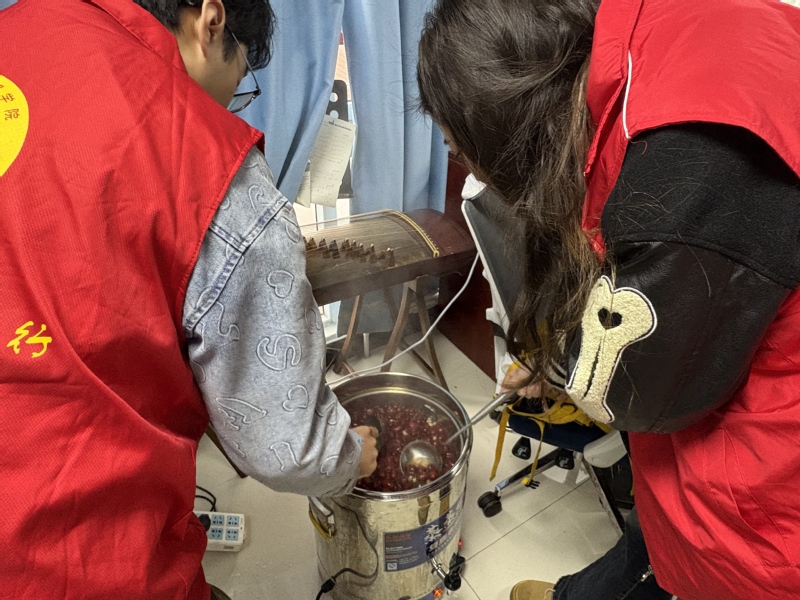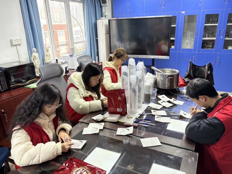 今年会第一党支部的学生党员和积极分子们分成多个小组,每组负责一个区域,有的负责材料的清洗、祝福贺卡的撰写及五红汤的制作,有的负责前往宿舍区,向宿管阿姨们表达节日的问候,有的则在医学楼内为教师送上热腾腾的五红汤,还有的专门在医学楼一楼设立流动服务点,向来往的同学递这份心意。五红汤,由红枣、红豆、红花生、红糖和枸杞熬制而成,不仅营养丰富,更寓意着健康、幸福与美好,每一碗都凝聚着学生们的心意与祝福。
